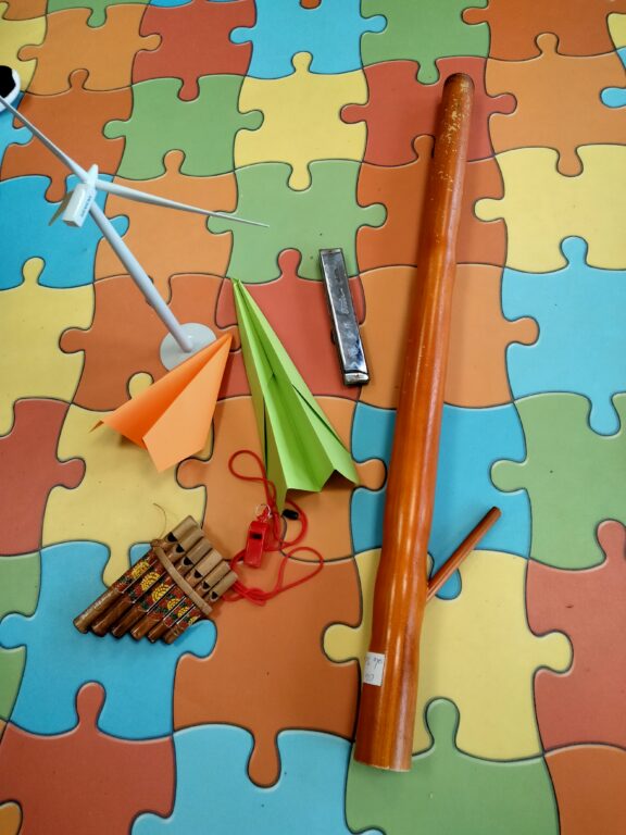 Des objets qui fonctionnent grâce à l’air: un avion en papier, une éolienne, un harmonica, une flûte de pan, un bouffadou, un sifflet et un lance-fusée!