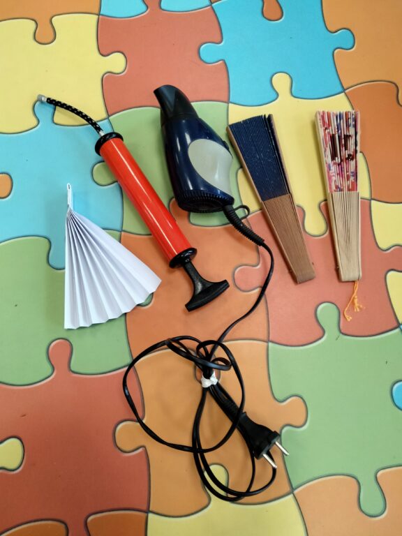 Des objets qui produisent de l’air: l’éventail, le sèche-cheveux, la pompe.