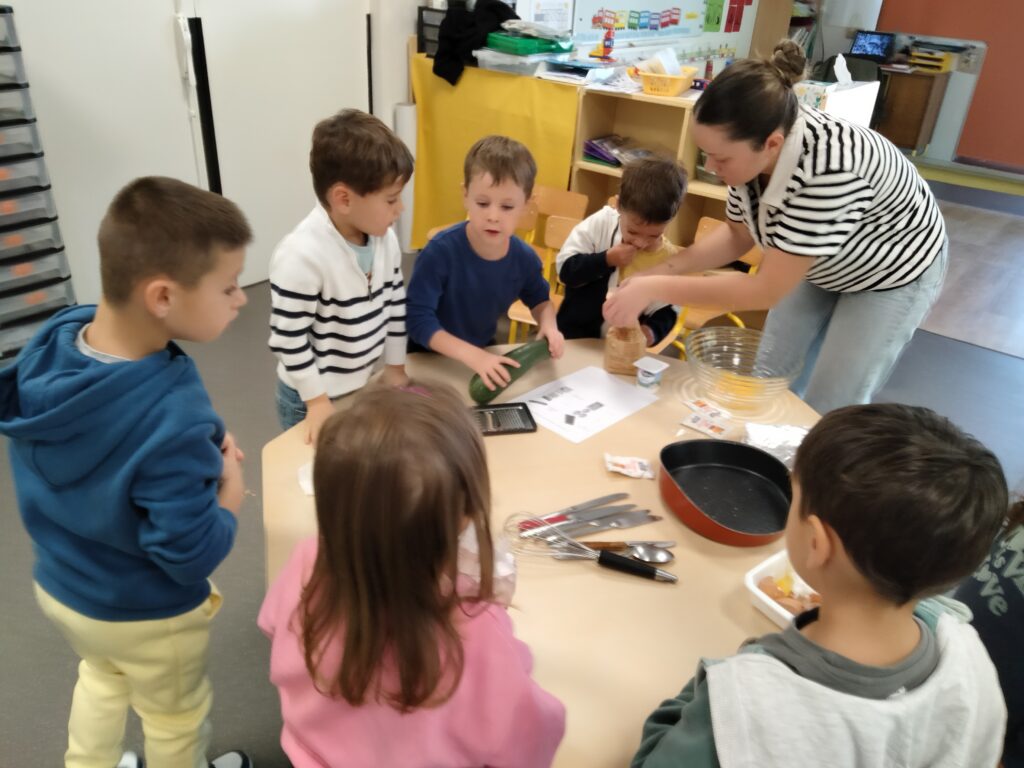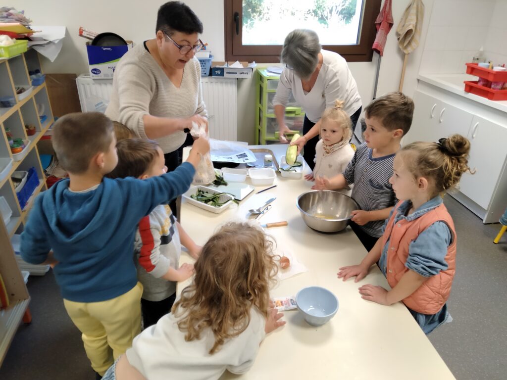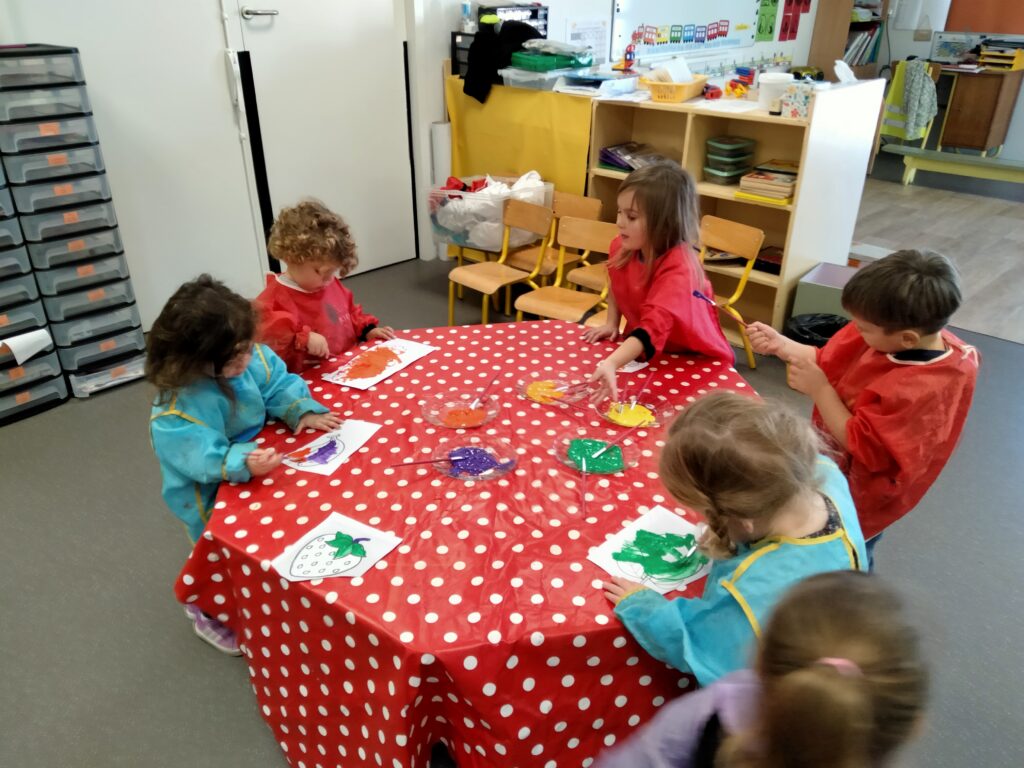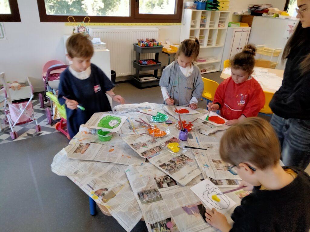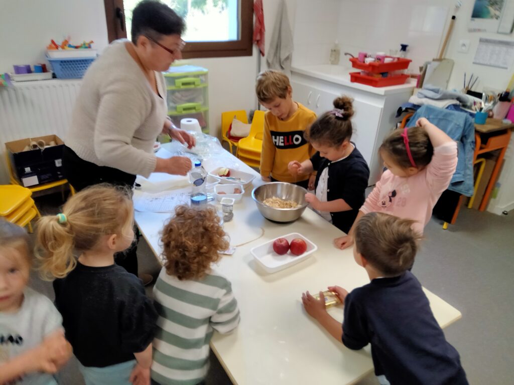 Du 6 au 9 octobre, nous avons participé à de nombreux ateliers autour du goût : jeu de loto autour des fruits et des légumes, langage oral pour découvrir la recette du jour avec ses ingrédients et ses ustensiles, cuisine, danses, découverte de différentes pommes et des légumes grâce à nos 5 sens, peinture de fruits et légumes, décoration de toques, découverte d’artistes (Arcimboldo et Paul Cézanne).