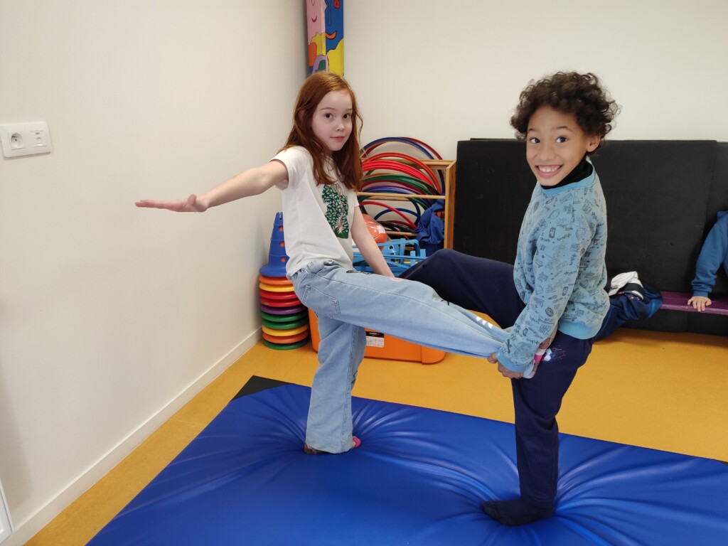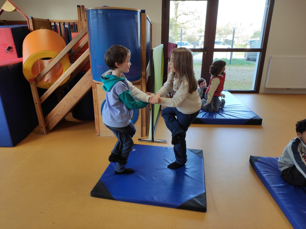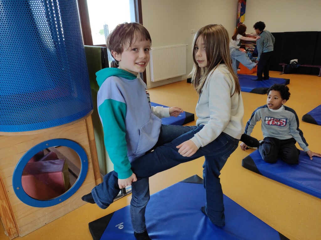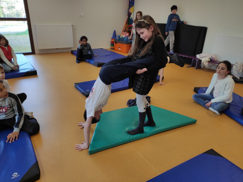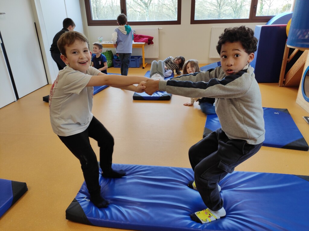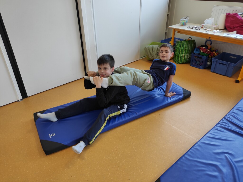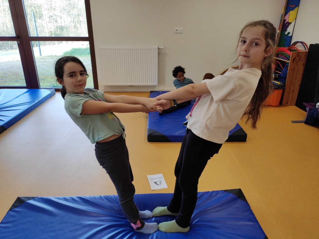 Un peu d’acrosportPar CE2 / 26 février 2026 Nous avons profité de la présence de tapis de gym dans la salle de sieste pour faire quelques séances d’acrosport.Par 2, les enfants devaient reproduire différentes positions.Pas toujours facile de garder l’équilibre !